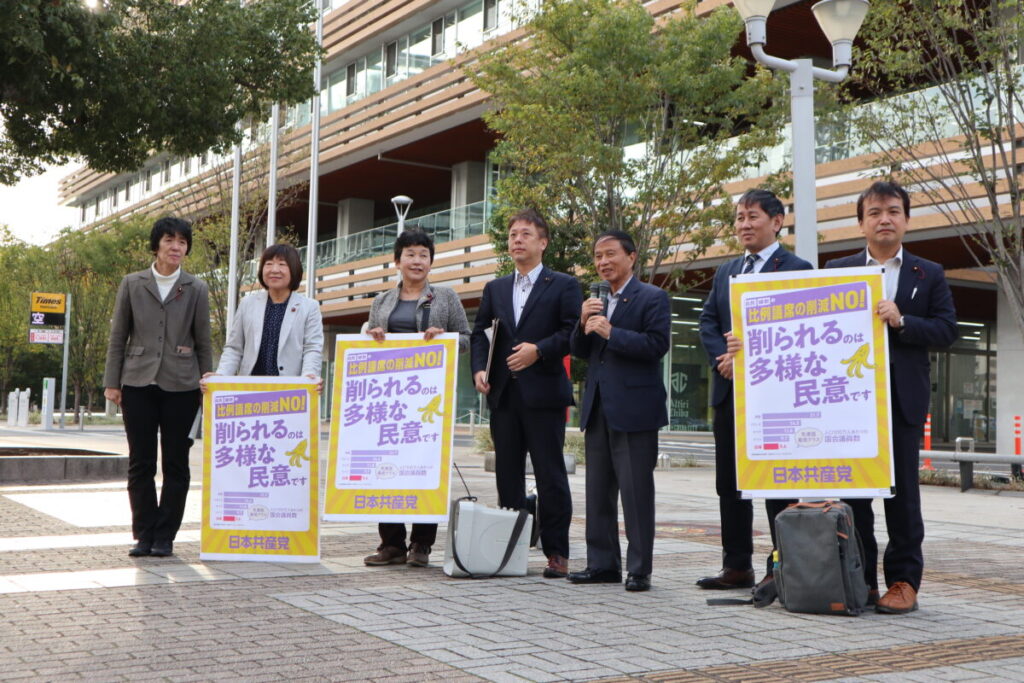 日本共産党千葉市議団は、市役所前で国会議員定数削減について、国際比較で見ても日本の国会議員数が少ないこと、比例削減となると民意がより反映されなくなること、身を切る改革なら、300億円を超える政党助成金こそ廃止すべきと訴えました。